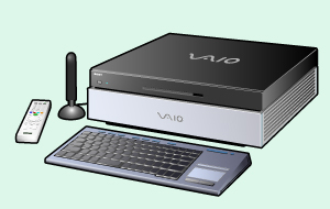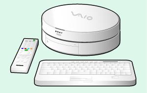Mac miniのリビングルーム向け機能とは、「Apple Remote」と新しくなった「Front Row」です。Apple RemoteはMac mini付属のリモコンです。iPodライクな操作感で、Appleの10フィートUIであるFront Rowを軽快に操作することができます。Front Rowは、新Mac miniにあわせてアップデートされており、DVD再生、iTunesに登録された音楽や音楽ビデオ、Movieフォルダ内の映像、さらにはiPhotoに登録された写真を楽しむことができます。ホームネットワーク接続された他のMacやPCに保存されている音楽や写真、映像も楽しむことができるようになっています。大画面テレビとの接続も可能ですが、HDMI端子は装備していません。 ソニーLivingPC / VAIO type X Living「大画面テレビとつないでハイビジョンの高画質をリビングで」のキャッチコピーで、ブルーレイディスクドライブを搭載したリビングルームPCとして登場しました。テレビサイドPC(TP1)と似たコンセプトですが、こちらは外観はオーソドックスなAV機器スタイルにまとめられています。