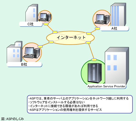 ASPの最大のメリットは経済性です。コストはアプリケーションを使った分だけの使用料で済み、特別なソフトウェアやハードウェアを購入する必要がなく、ライセンス料や導入コストも不要です。サーバやソフトウェアの運用、保守、管理はASPベンダーが行うため、ユーザー側では維持管理のための人的リソースも不要です。設置スペースなどの環境コストも不要です。機器の調達、設定、ソフトウェアの導入も短期間で行うことができます。
