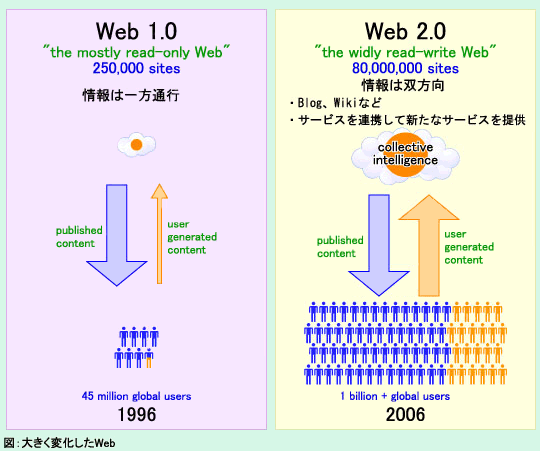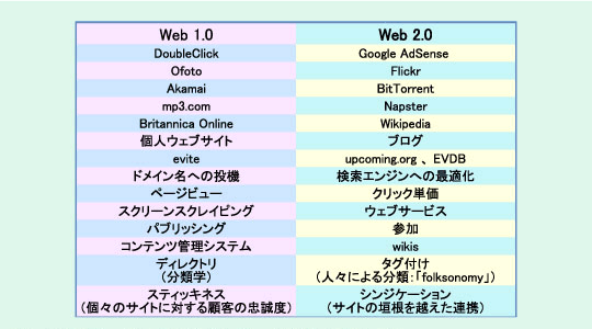 上記の2つのサイトが、Web2.0以前のWebサイトと大きく異なっているのは、「ユーザー自身の手でコンテンツが作られていること」、「衛星写真や航空写真のような貴重なデータを、だれもが手軽にストレスなく利用できること」です。どうしてこんなことができるのでしょうか。Web2.0とそれ以前を比較することから始めましょう。 Web2.0ってどんなことWeb2.0があるのだから、Web1.0もあることが考えてしまいます。実際には、Web1.0というときは、Web2.0と比較するときに、Web2.0以前を便宜的にそう呼ぶことが多いようです。世界で初めてWeb2.0を提唱したTim O'Reilly氏はWeb2.0を次の表で示しました。Web2.0の紹介ではよく使われる有名な表です。