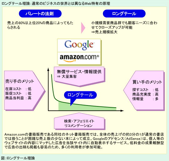 DoubleClick社とGoogle社という構図は、一見するとビジネスモデルの隆盛、技術の進歩、時代の変遷と捉えがちですが、その底流には、Webの進化があります。上図の「ロングテール理論」がリアルな世界の常識を変えてしまうように、Webの進化によって大きな変化が数多く生まれるのです。 Web2.0の次にくるものWeb2.0はいかにも過渡期であって、3.0、4.0と続いていくような印象を与えます。しかし、現実はWeb2.0そのものにも確実な定義があるわけではないので、Web3.0となるのか、それともそれ以外のものになるのか、明確ではありません。しかし、Web2.0がこのまま進化し、Webがプラットフォームとして、その上でサービスやアプリケーションが当然のように動作するような状況になったときにWebそのものよりもその上でのサービスやアプリケーション、さらにはその中で使われるデータの方が重要になってきます。だからこそ、PCにおけるMicrosoft、検索エンジンのGoogleのように、Web2.0以降の覇者を目指して、各社は自Webサイトのサービスの公開を急ぎ、永遠のベータ版として多くのユーザーを巻き込んで終わりのない開発を進めています。しかし、Web2.0はまだこれからです。Web上にどのようなサービスやアプリケーションが登場するか、まだまだ期待できそうです。 参考URL