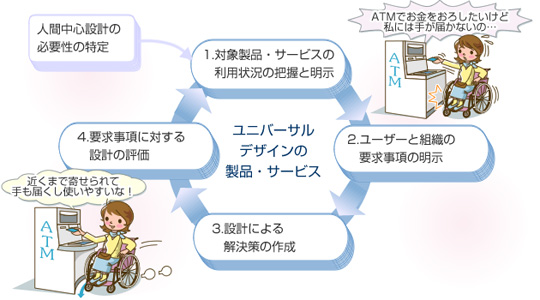 例えば、ATMの本体全面がへこんでいる(ラウンドボディ)のを多くの人は知っていることでしょう。しかし、なぜこのような形態になっているのかまでは理解できません。これは、車いすの人の利用を配慮しての措置なのです。