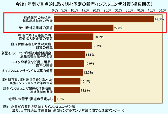 経団連の調査によれば、多くの企業が今後重点的に取り組むべき新型インフルエンザ対策として、「継続業務の絞り込み・業務継続体制の整備」、そして「発生時対応訓練の実施」など、より具体的な対策策定の必要性を認識していることがわかっています。