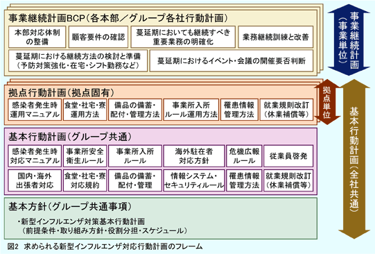 企業における新型インフルエンザ対応行動計画の策定は急ピッチで進みつつありますが、課題もあります。それは策定された計画が実際の行動手順として有効であるかの検証(訓練)、そして具体的な対策の実施です。また、国や自治体のガイドラインなどの変化、新たな情報に対応しつつ、いかに策定した行動計画を修正し、最新の状態に維持するかも大きな課題です。行動計画策定は、計画修正時の反映が迅速に行えるよう、計画自体の構造化を踏まえて行う必要があります。またその計画が実際に機能するかどうか、あるいは抜け漏れがないかを、常に訓練を通して検証する必要もあります。