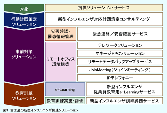 新型インフルエンザA(H1N1)の流行は収まる気配もありません。その一方で高病原性の鳥インフルエンザウイルスが人から人へ感染する過程で変異し、致死率の高い新型インフルエンザの流行・パンデミック発生の危険性が高まり、企業の対応検討は待ったなしの状況です。富士通では、自社の新型インフルエンザ対応で培ったスキル、ノウハウをベースに行動計画策定、事前対策、教育訓練の3つのソリューションにより、お客様の新型インフルエンザ対応を支援しています。