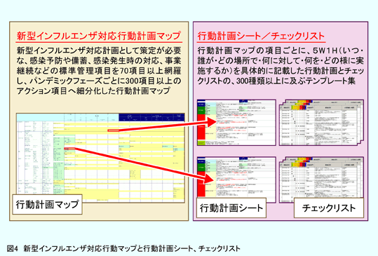 行動計画の内容は、パンデミックのフェイズごとに実行されるべきアクションとして細分化され、アクション一つひとつについて「誰が、何を、いつ、どこで、どのような目的で、どうやって(5W1H)」の視点で具体的に記載、チェックリストを用意して有事に備えることができます。テンプレートのライブラリは常に更新、随時変化が予想される新型インフルエンザに関する行政の施策、医療機関体制、お客様の事業環境に対応した最新のテンプレートを提供します。