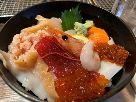 焼き物が食べ終わると、次は海鮮丼が出てきました。ネタ数も多く、またご飯の量も大盛だったので、食べきれるか心配でしたが、美味しかったので問題なく間食できました。