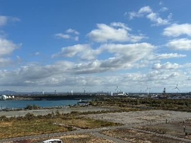 また屋上では、対岸のLNG(液化天然ガス)基地や洋上の風力発電機を臨むことができました。