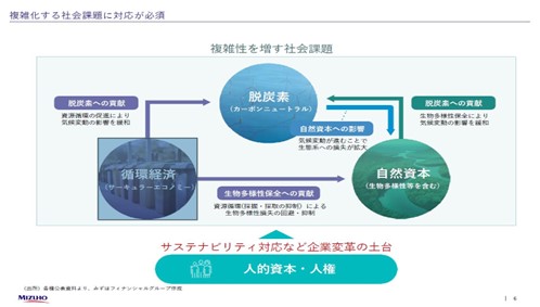 社会課題は複雑性を増しています。気候変動対策を踏まえた「脱炭素」、生物多様性を含む「自然資本」、「循環経済」、これらを一体で捉えていくことが大事であると考えています。