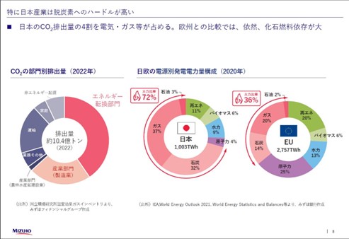 一方でこの問題は簡単でないことも事実です。新しい技術、イノベーションが求められます。技術革新、イノベーションにはリスク、不確実性が多いので、金融の立場からすると、融資やローンの形で支援しにくい部分があります。みずほとしては、エクイティ出資と呼ばれる出資の観点でお客様のイノベーションを支援しています。
