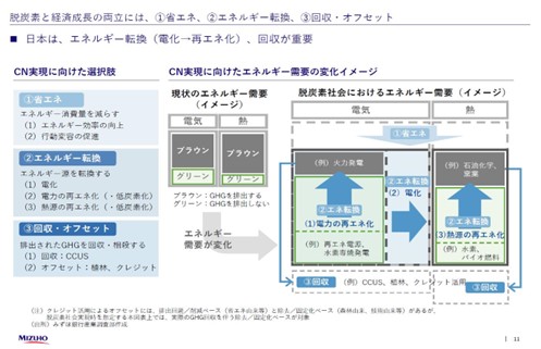 一つめは「省エネ」です。日本は国際的に省エネが進んでいます。二つめは「エネルギー転換」です。脱炭素のために電力に切り替えると同時に、その電力を再生可能エネルギーで賄おうという取り組みです。三つめが排出されたGHG(温室効果ガス)を回収・相殺する「回収・オフセット」です。これら三つを組み合わせて、エネルギー転換を中心にバランスを取りながら進めていく、これがまさに日本の脱炭素戦略であると私は考えています。