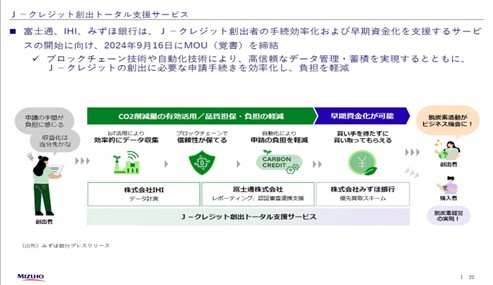 また、みずほでは、IT部門との連携ということで、富士通・IHIと共同で国が管理しているカーボンクレジットの取引を効率化する「J-クレジット」というシステムを作っています。このテーマは非常に難しく、時間もかかるので、私たち金融だけで達成できるものではありません。IT産業の果たすべき役割が非常に大きいと考えています。