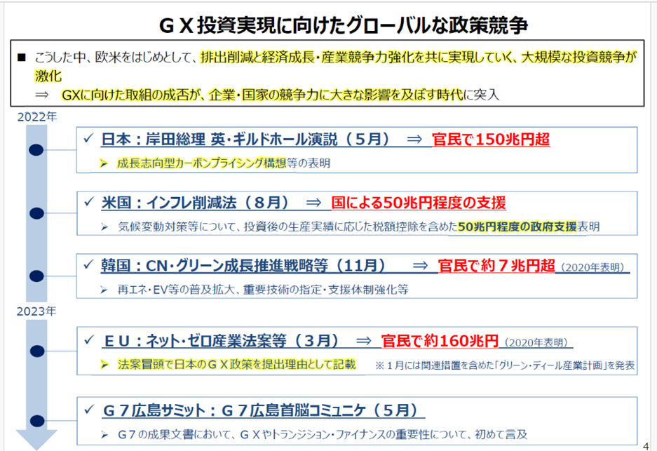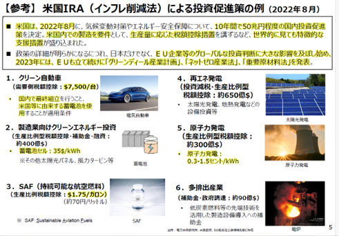 日本も今後20年間で官民合わせて150兆円超の投資を実施していく予定です。アメリカでは、2022年8月に過度なインフレを抑制すると同時にエネルギー安全保障や気候変動対策を迅速に進めることを目的としたインフレ削減法(IRA)が成立し、50兆円程度の投資が決定しています。アメリカ国内で製造を要件に生産量に応じた税控除措置を講ずるなど、世界的に特長的な措置が盛り込まれています。