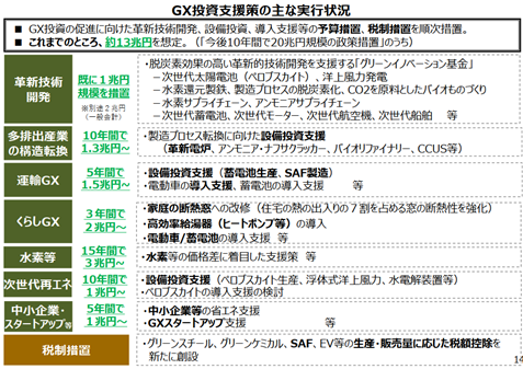 具体的な支援策として、ペロブスカイト、洋上風力、水素還元製鉄などの新技術に約1兆円程度を支援し、その他にもCO2の多排出産業の構造転換、高炉を非常に品質の高い電炉に変えていくための設備投資支援、電動車の導入支援、蓄電池の導入支援、家庭の断熱窓導入やヒートポンプ導入なども進めています。あるいは、水素の導入を支援するための価格差に着目した「値差支援策」という法律も提出して実行しています。こうした支援策を合わせて約13兆円の投資を実施する計画です。