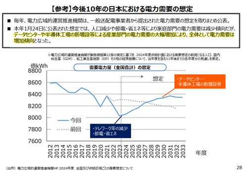 我々のGX政策は「GX2040」として、2024年末にエネルギー基本計画と一体となって取りまとめられることが前政権の中で決められました。GX2040、エネルギー基本計画で議論になっているのが、データセンターの電力需要の想定です。これまでは電力需要量が落ちてくる傾向にあったのですが、これからは一気に電力需要が伸びてくると想定されています。その理由はデータセンターや半導体工場の新設などがあります。