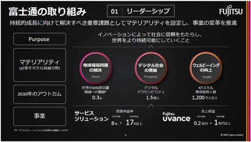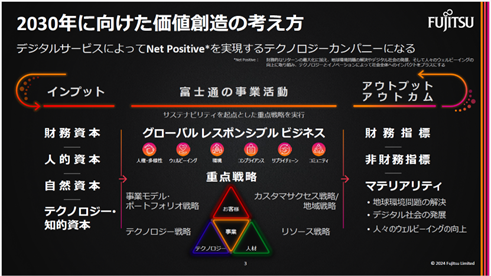 富士通では2020年、「イノベーションによって社会に信頼をもたらし、世界をより持続可能にしていくこと」というパーパスを掲げました。そして、2023年度からの中期経営計画の中では、「2030年に向けた価値創造の考え方」として、デジタルサービスによってNet Positiveを実現するテクノロジーカンパニーになることを打ち出しています。