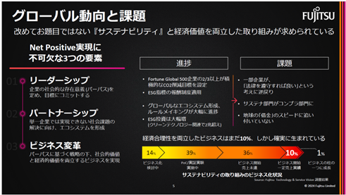 Net Positiveの実現に向けたグローバルの動向を見ると、例えばFortune Global 500企業の3分の2以上がCO2削減目標を設定しているなど積極的な取り組みも見られています。富士通が「サステナビリティの取り組みのビジネス化状況」について調査した結果でも、サステナビリティと経済価値(経済合理性)を両立したビジネスはまだ10%程度ではありますが、確実に生まれて来ている状況です。こうした中、各企業においても富士通においても、2030年や2040年を見据えて、持続的かつ長期的にサステナビリティと経済性を両立させた取り組みを粘り強く続けていくことが大切であると考えています。