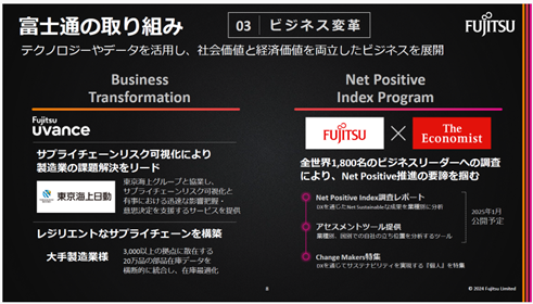 「ビジネス変革」の領域における富士通の取り組みでは、テクノロジーやデータを活用して社会価値と経済価値を両立した、さまざまなビジネスを展開しています。例えば、東京海上グループとはサプライチェーン全体のリスクの可視化、有事における迅速な影響把握と意思決定を支援するサービスを共同開発して提供しています。また、大手製造会社との協業では3,000以上の拠点に散在している20万点を超えるパーツのデータを横断的に管理し、在庫管理の最適化を図りました。