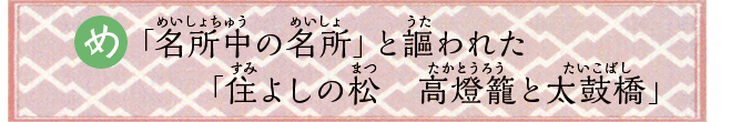 かるたに描かれている反橋は、まだ海の面影を残す江戸時代の情景。左手にある高灯籠は鳥居の前の浜にあった燈台だ。高さが約16m。展望台としても眺望がすばらしく「名所中の名所」と謳われた。ちなみに、この高燈籠は昭和25年(1950)のジェーン台風で木造部分が破壊され石組だけになった。昭和47年(1972)には道路拡張のために撤去されたが、2年後に国道26号線沿いの現在地に復元された。