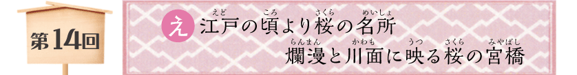 地名でもある「桜ノ宮」の名は、橋から500mほど北にある「櫻宮(桜宮神社)」に由来する。しかし、この神社を含む一帯が桜の名所になったのは江戸時代以降だ。