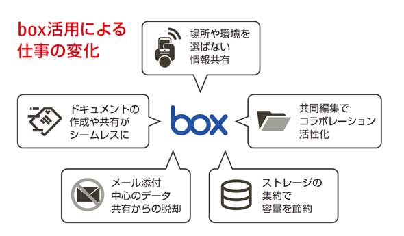 情報共有手段において、メール添付中心からBoxによる共有にすることで、メールの誤添付や誤送信に関してもリスクを低減できる。その上、法人向けライセンスでは保存容量が無制限のため、社内のストレージ容量を節約することができるのもBox導入のメリットといえる。