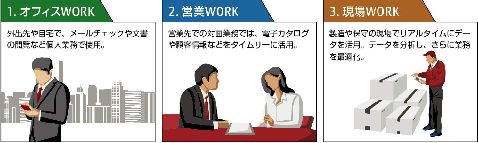 - 音声通話やメールチェック、スケジュール管理、ワークフロー管理などの業務現場に ICT を導入することで、外出先や自宅など、いつでもどこでも業務を行えるようにします。