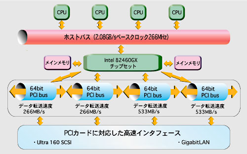 最大2.08GB/sの転送速度を持つプロセッサホストバスを採用し、プロセッサからメモリ間のデータ転送を飛躍的に向上しました。また、PCIバスの7系統化、及び64bitPCIバスの採用により、複数のI/Oデバイスを高速に動作させます。
