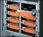 最大160MB/sの転送速度を持つ「Ultra160 SCSI」の採用(オンボード)、および15,000回転の高速HDDの採用により、高速データ転送を実現。また、内蔵HDDを最大8台搭載し、587.2GBまで拡張できます。オプションの基本ドライブケージ変換機構により、内蔵で最大12台/2チャネル(880.8GB)に拡張でき、ディスク負荷分散した高性能ディスクシステムを実現します。