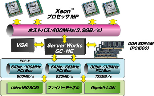 400MHz(最大3.2GB/s)の高速フロントサイドバスをサポートするServerWorks社「GC-HEチップセット」を採用することで、Xeon™プロセッサMPの性能を引き出し、優れたパフォーマンスを発揮します。