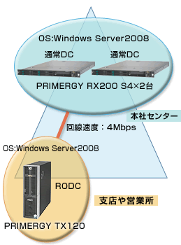 Read-Only Domain Controller(RODC)は、認証専用のドメインコントローラです。主に支店や営業所への設置を目的として、Windows Server 2008のActive Directory(AD)に新たに追加された機能です。また、PRIMERGY TX120は、省スペース、省エネルギーを実現しており、静かな環境での設置が求められる支店や営業所に最適なサーバです。